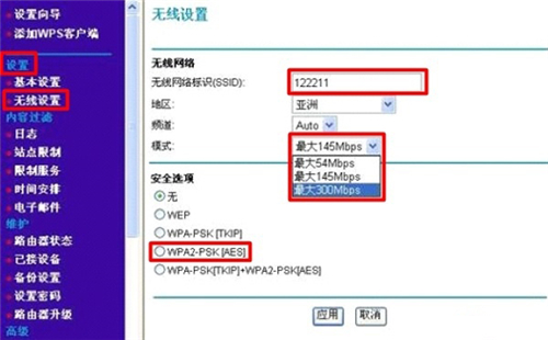 点击“设置”——>“无线设置”——>设置“无线网络标识(SSID)”——>“模式”选择:最大300Mbps——>选择“WPA2-PSK[AES]”——>设置“密码”——>点击“应用”