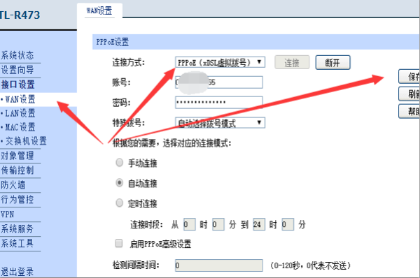3、登录进入到路由器以后,点击接口设置下的WAN设置,在主界面中输入网络上网账号和密码,选择如拨号上网然后点击保存按钮。